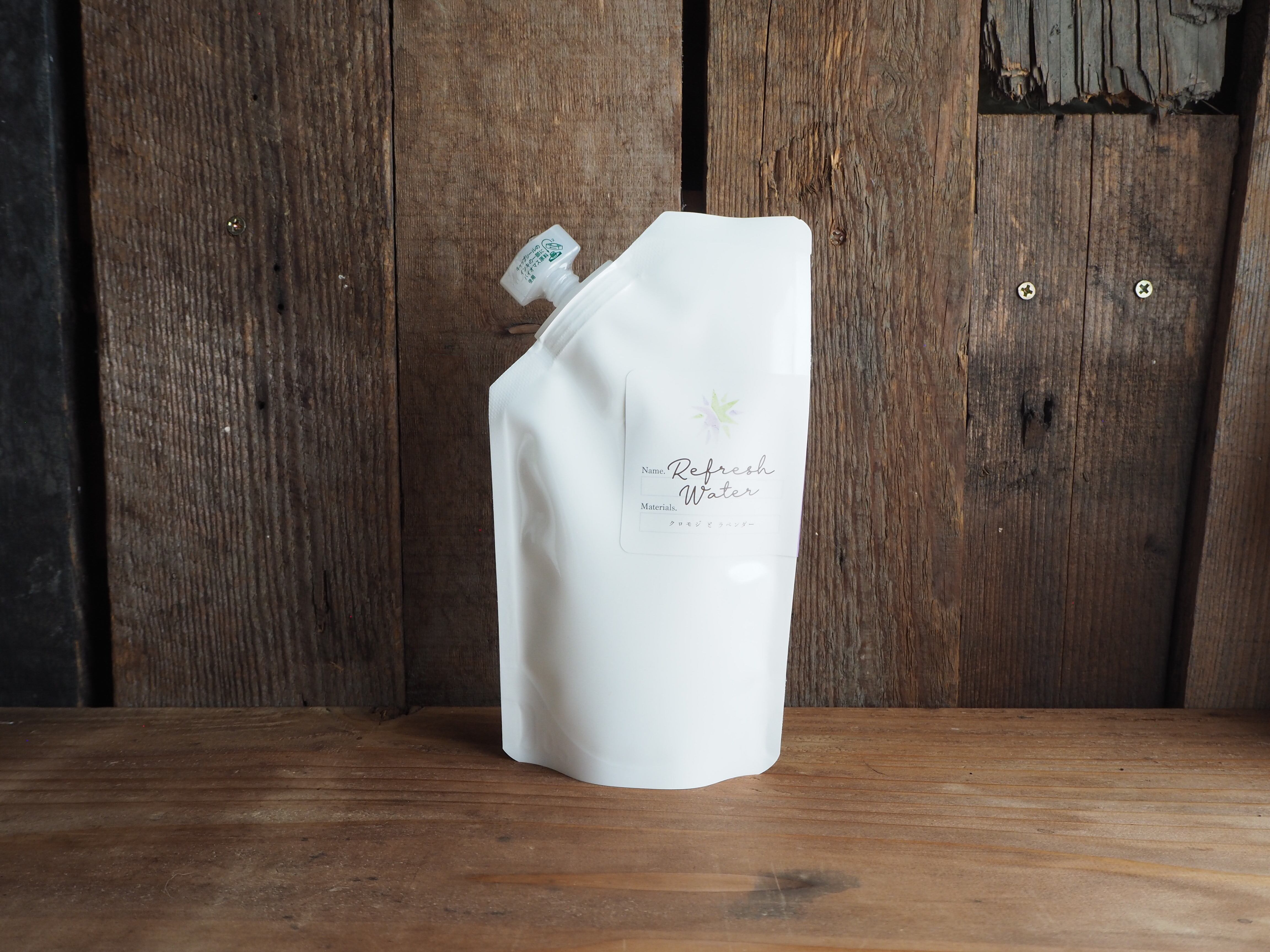 「クロモジとラベンダーのリフレッシュウォーター」の詰め替え用パウチです。お手持ちのスプレーボトルに入れ替えてお使いください。100ml入りのお得サイズです。